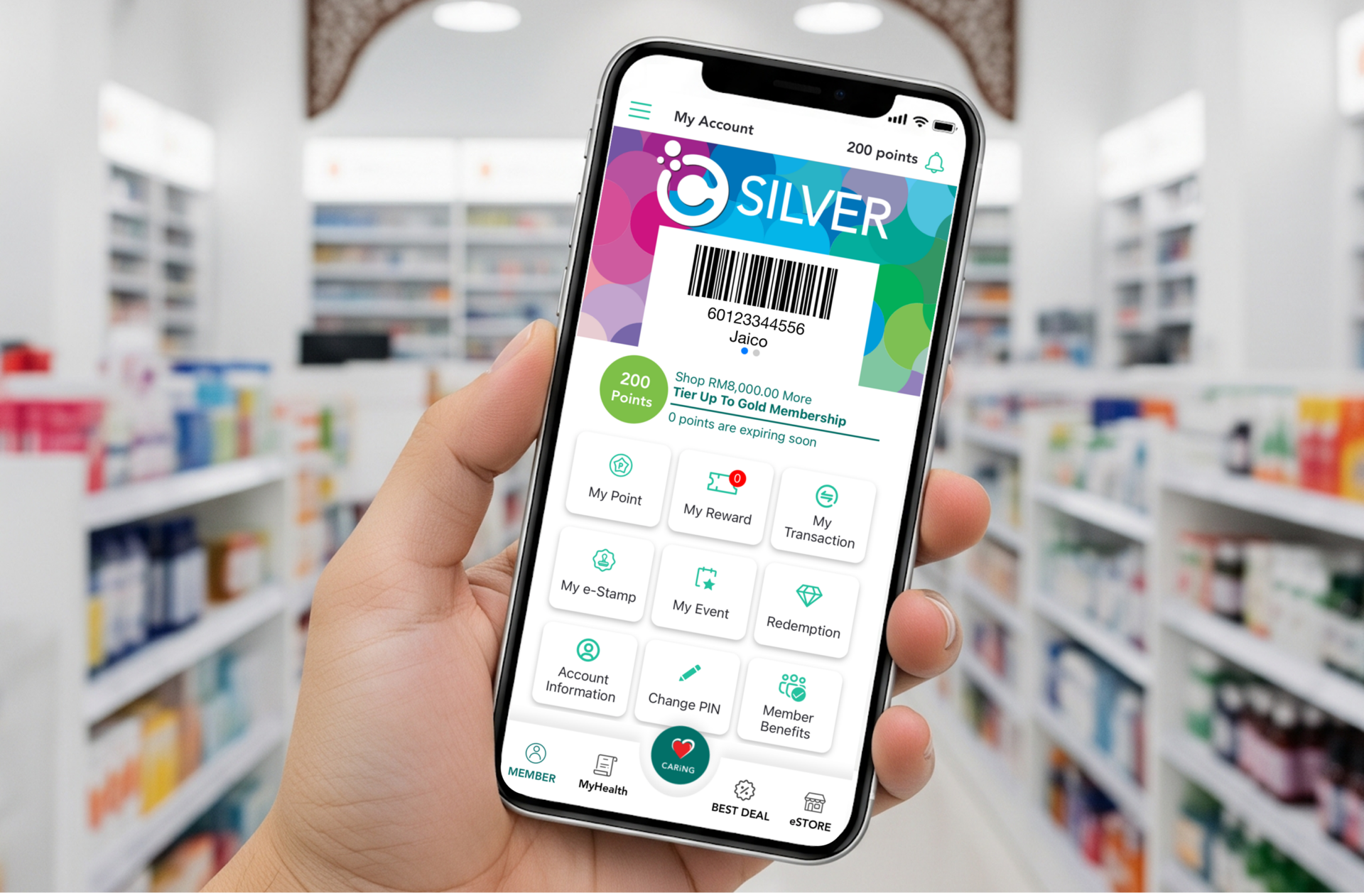 One of the biggest hurdles for retail loyalty in Southeast Asia is the “checkout friction”—the awkward moment when a customer has to search for an app while a queue builds up. Caring Pharmacy solved this with a high-contrast, barcode-based earning and redemption system.