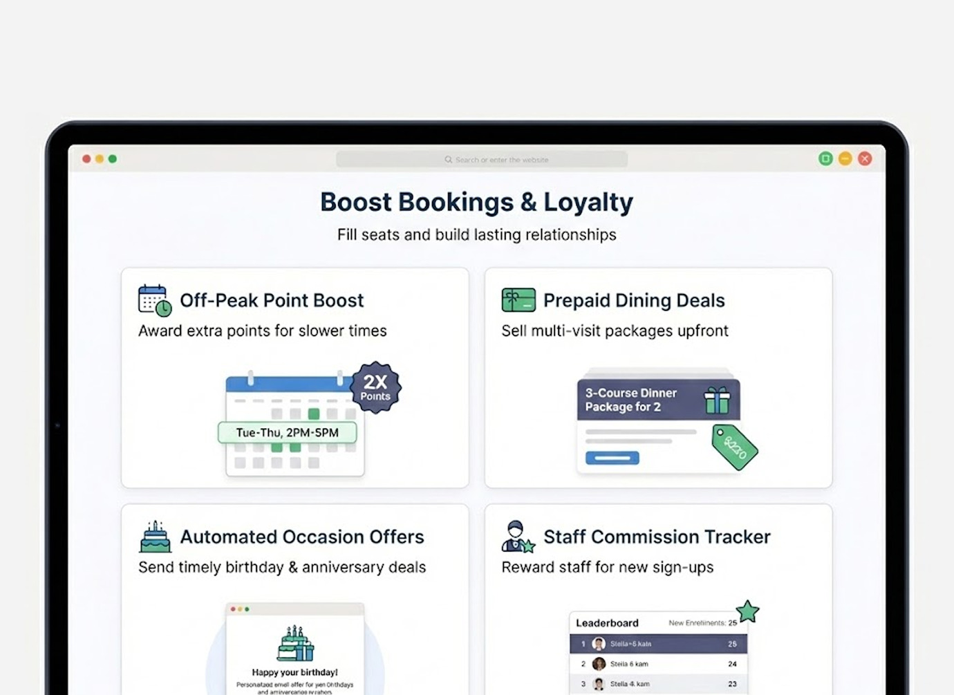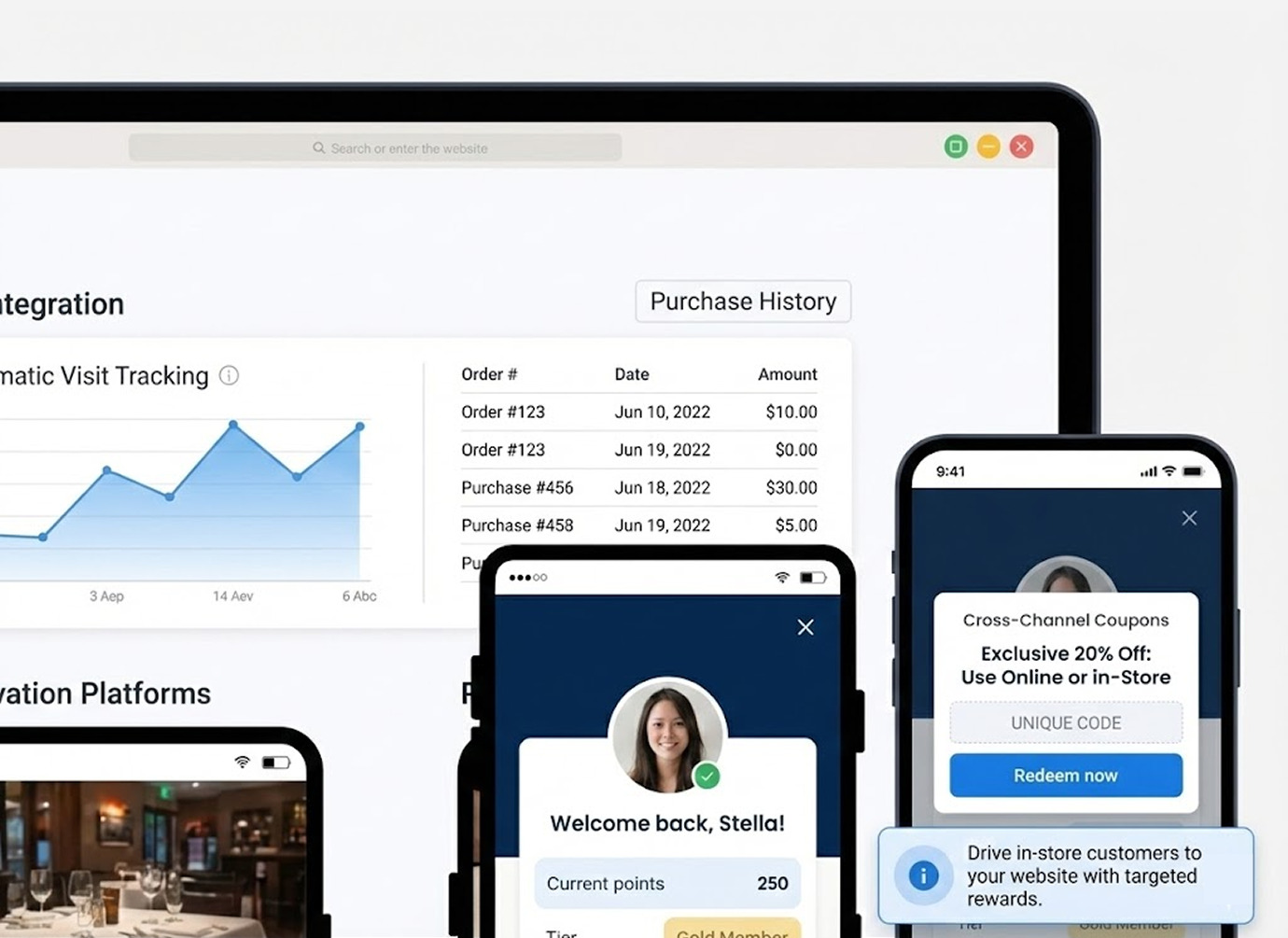 Connects with leading restaurant point-of-sale systems to automatically track visits and awards