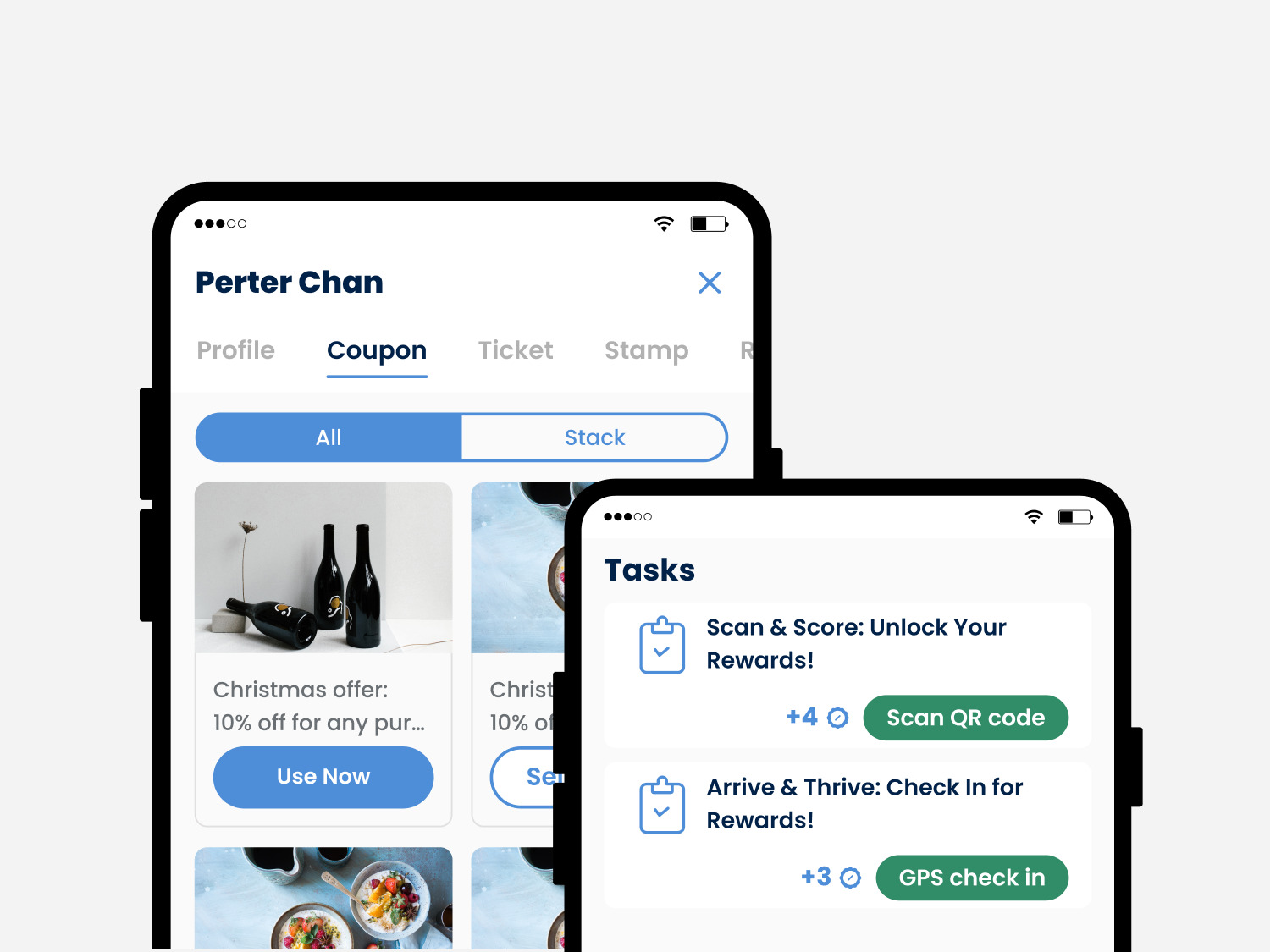 Customers scan or tap to collect stamps; staff confirm redemptions using an intuitive frontline app.